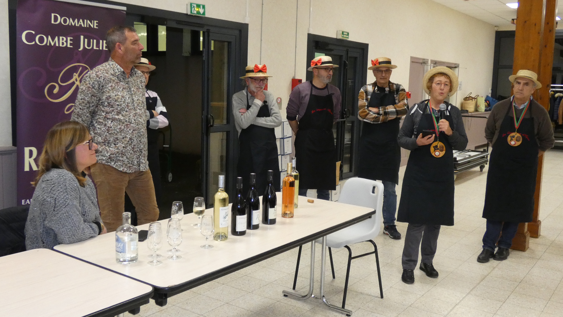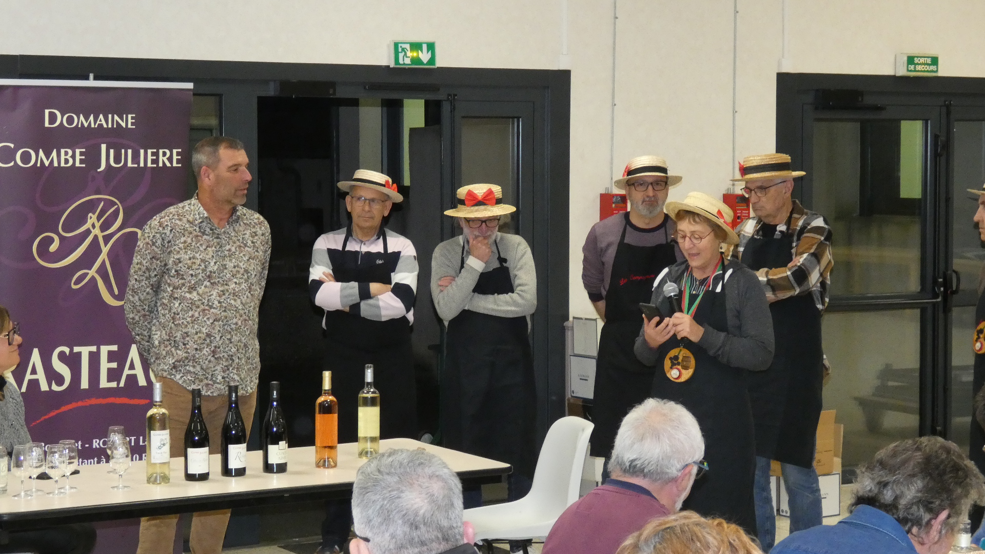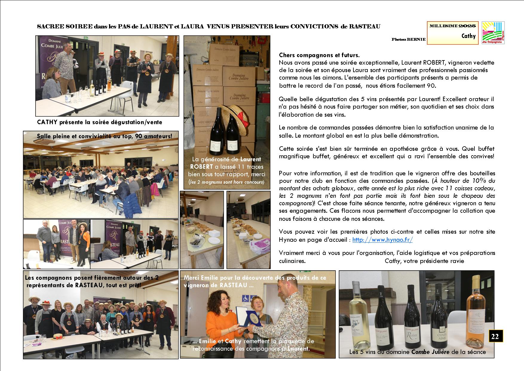 Pour leur traditionnelle soirée annuelle dégustation/vente, les Compagnons d'Hynao ont convié cette année le domaine Combe Julière à Rasteau (84). Le sympathique viticulteur Laurent Robert a présenté sa gamme de produits en appelation Côtes du Rhône et Rasteau. Les convives ont apprécié ses vins et le buffet préparé par les Compagnons.